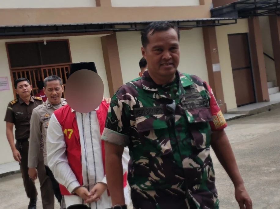 Foto: Terdakwa kasus pencabulan santri di Kukar saat menuju ruangan sidang.