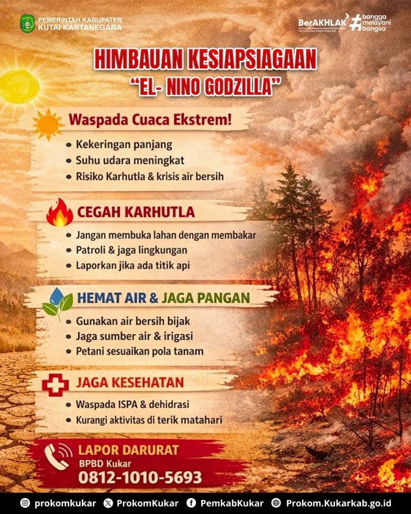 Akupedia.id, Tenggarong – Pemerintah Kabupaten Kutai Kartanegara (Pemkab Kukar) menerbitkan Surat Edaran Nomor B–781/BPBD/300.2.1/04/2026 tentang himbauan kesiapsiagaan menghadapi fenomena El Nino atau anomali cuaca ekstrem tahun 2026.