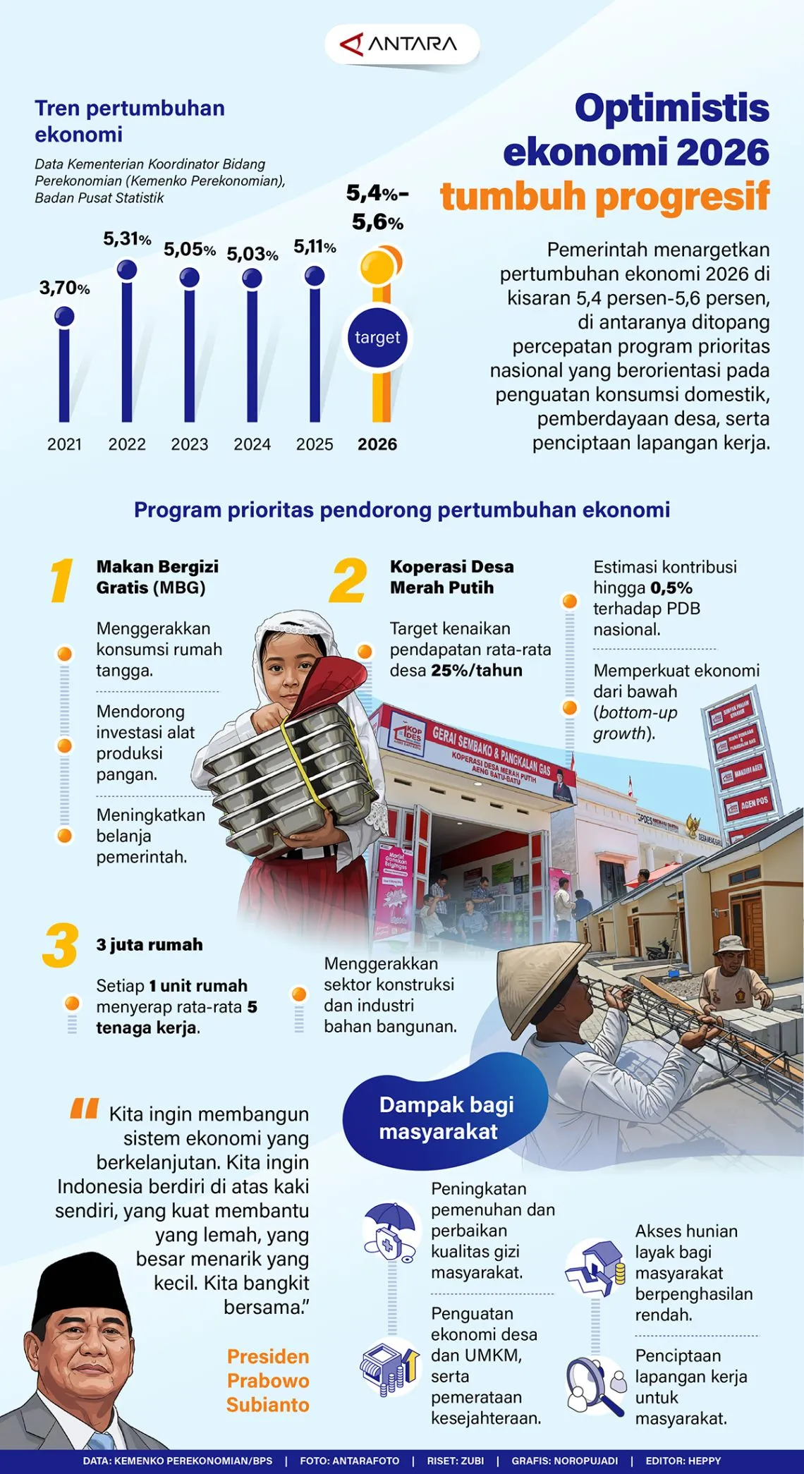 Pemerintah menargetkan pertumbuhan ekonomi 2026 di kisaran 5,4 persen-5,6 persen, di antaranya ditopang percepatan program prioritas nasional yang berorientasi pada penguatan konsumsi domestik, pemberdayaan desa, serta penciptaan lapangan kerja.