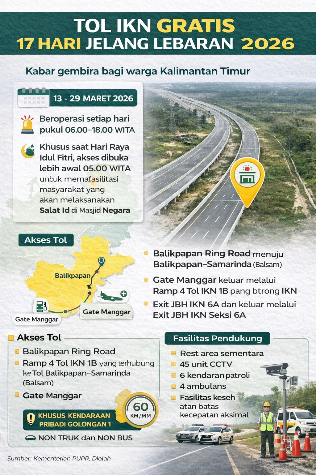 Kabar gembira bagi warga Kalimantan Timur. Menjelang Hari Raya Idul Fitri 1447 Hijriah, ruas Tol Ibu Kota Nusantara atau Ibu Kota Nusantara dibuka gratis selama 17 hari, mulai 13 hingga 29 Maret 2026.