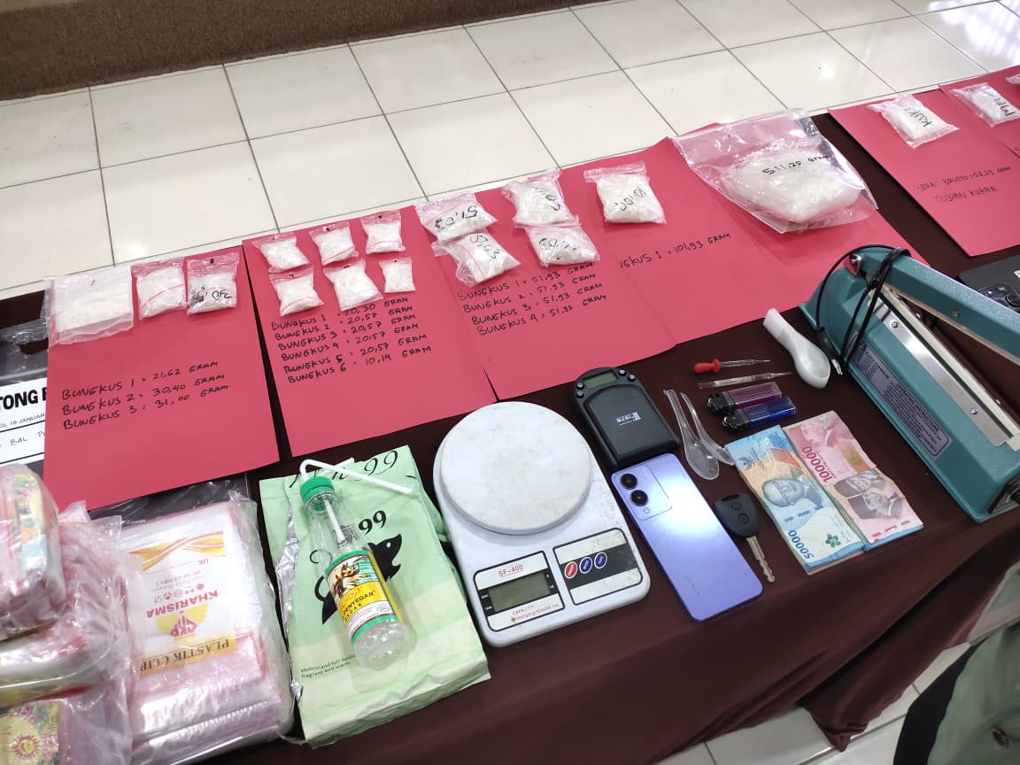 Saat diamankan, tersangka G kedapatan sedang membungkus dan menimbang narkotika jenis sabu di dalam kamar kontrakannya. Dari lokasi tersebut, petugas menyita 16 bungkus sabu dengan berat kotor total 1.081,38 gram, serta berbagai peralatan pendukung peredaran narkotika, seperti timbangan digital, alat press plastik, bong, pipet kaca, dua unit telepon genggam, uang tunai, dan satu unit kendaraan roda empat.