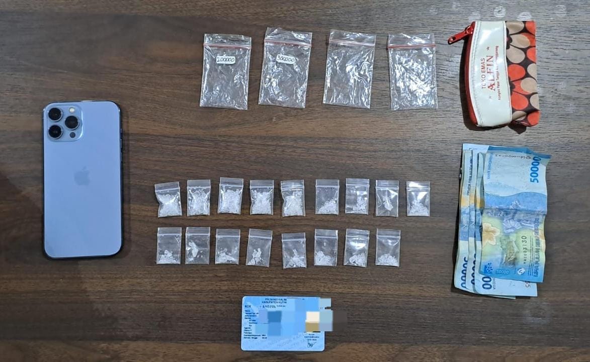 Dari hasil penggeledahan di kamar tersangka, polisi menemukan sebuah dompet yang disimpan di laci, berisi 17 bungkus plastik bening yang diduga berisi narkotika jenis sabu dengan berat kotor mencapai 9,63 gram. Selain itu, petugas juga mengamankan sejumlah barang bukti lain berupa plastik klip, uang tunai Rp350 ribu, serta satu unit telepon genggam.